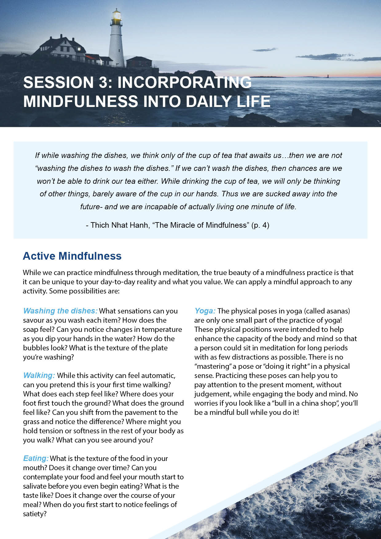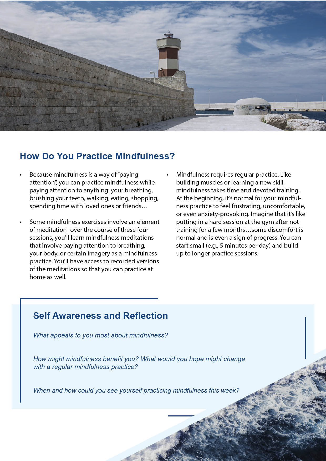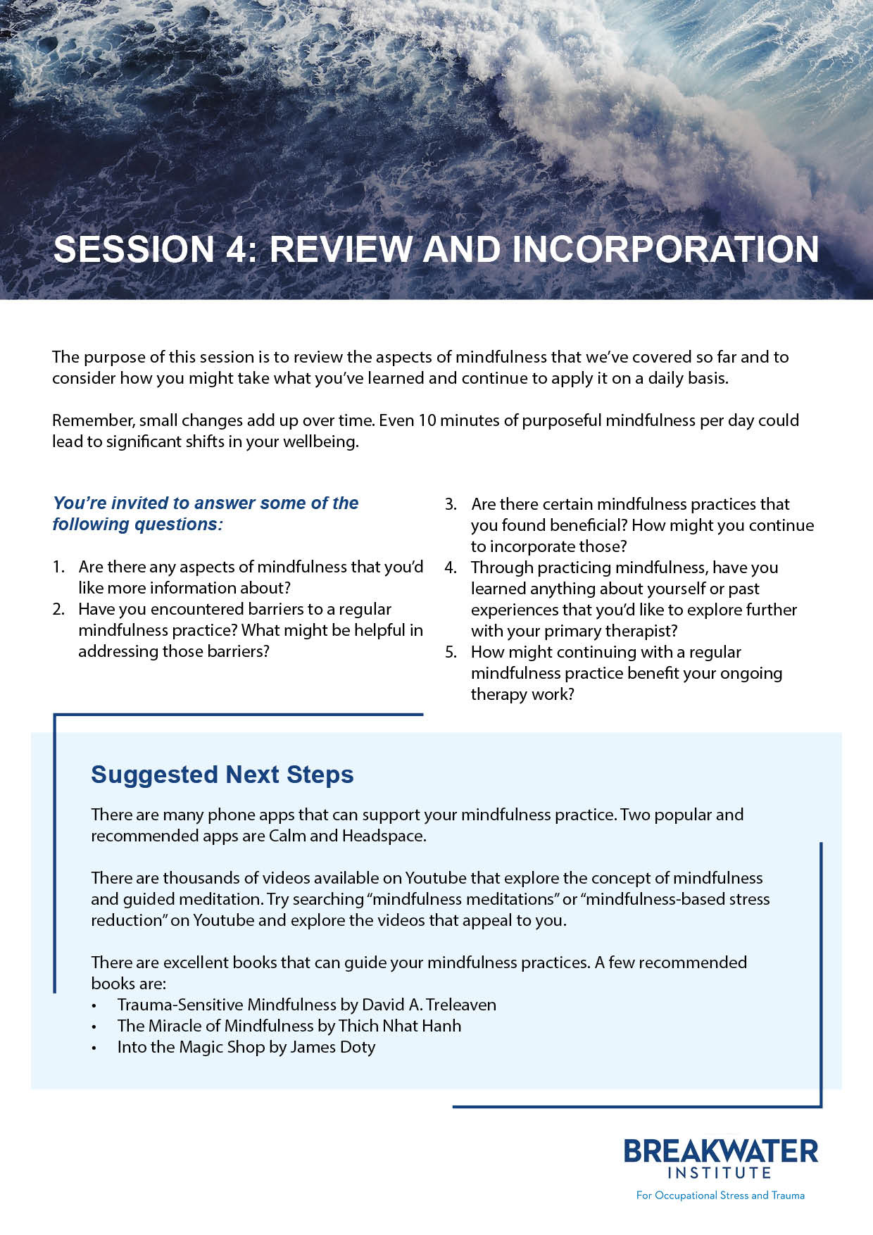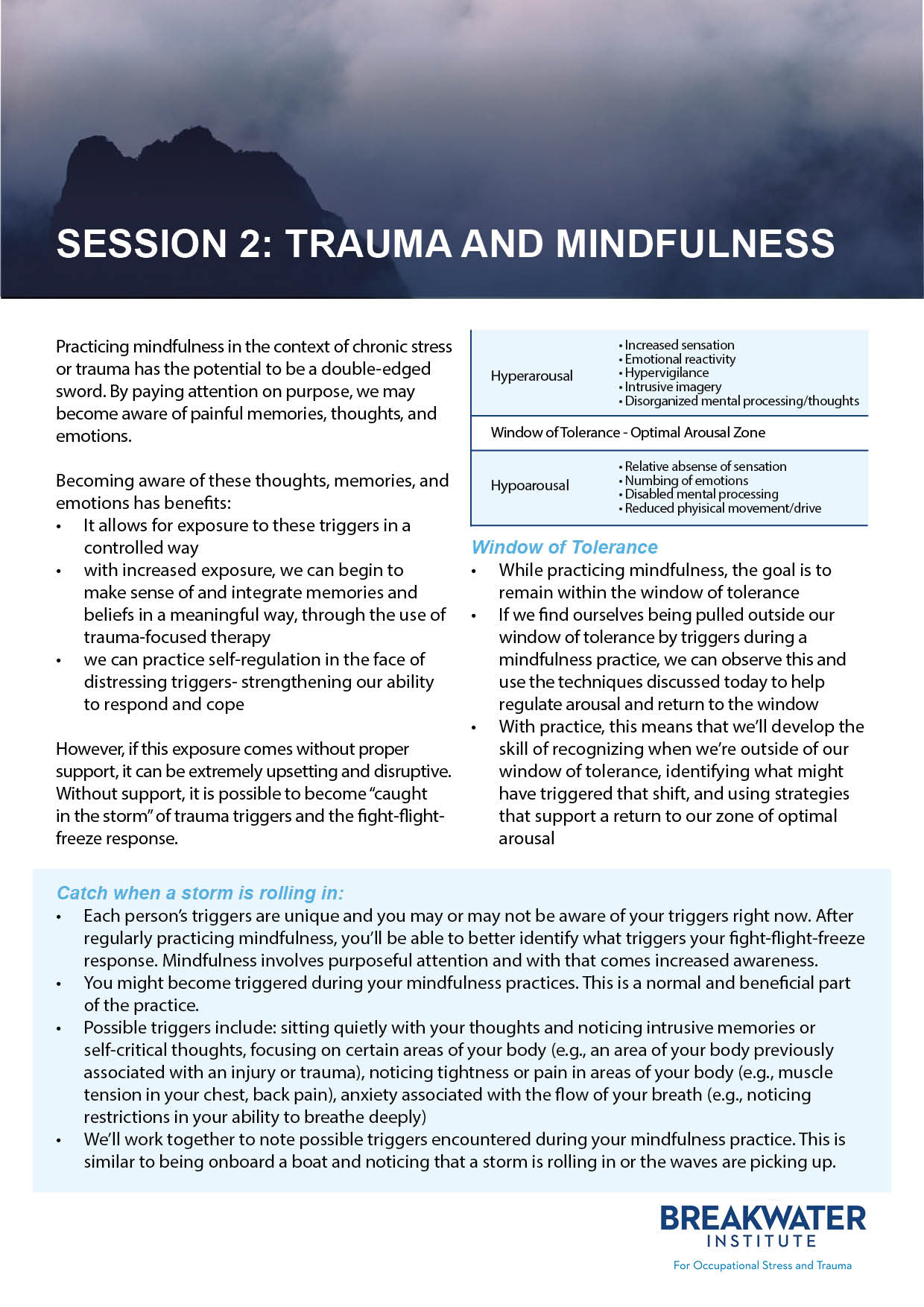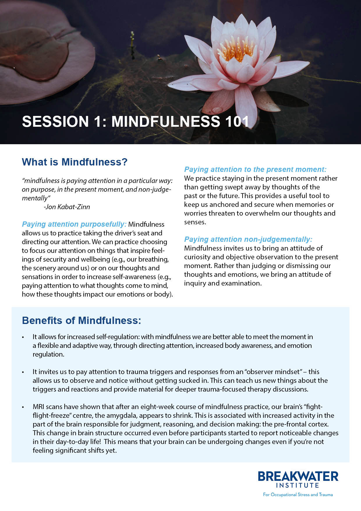 In Spring of 2020, I performed freelance design services for The Breakwater Institute for Occupational Stress and Trauma, a centre dedicated to providing mental health services to first responders, military personnel, veterans, and their families. While working for the Breakwater Institute I created branded content in the form of company brochures, powerpoint slides and business cards. Additionally, I created a series of handouts dedicated to the practice of mindfulness. These handouts will be given out between sessions with clients to give further information on resources and techniques for practicing mindfulness in their everyday lives.